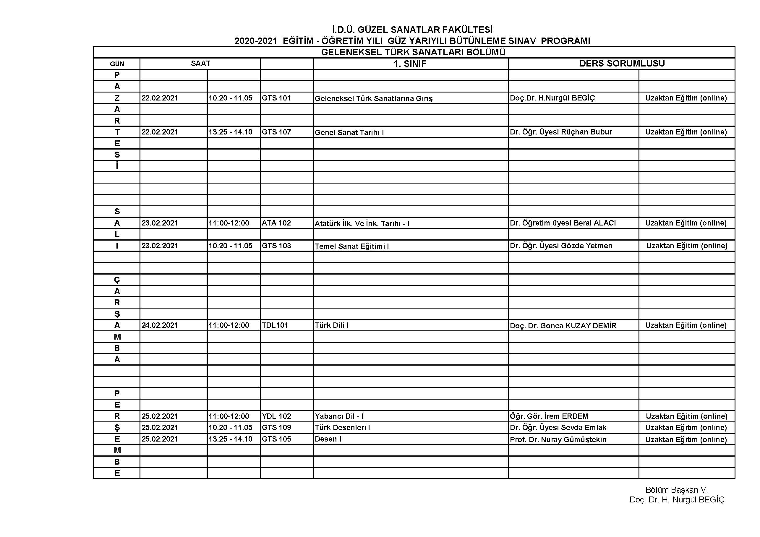 Geleneksel Türk Sanatları Bölümü 2020-2021 Güz Dönemi BÜTÜNLEME Sınavı Tarihleri için