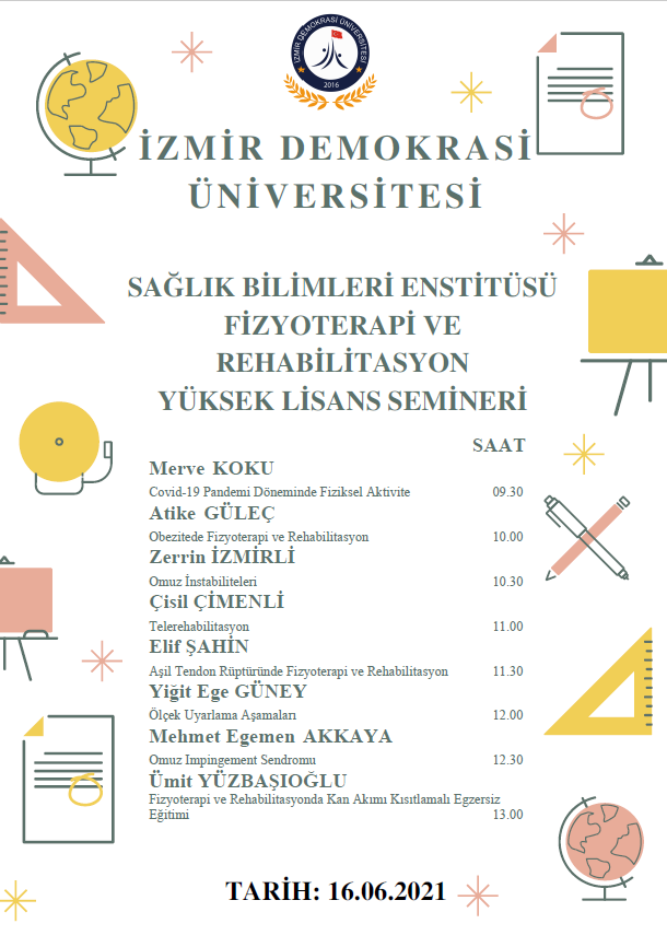 Üniversitemizin Sağlık Bilimleri Enstitüsü Fizyoterapi ve Rehabilitasyon Anabilim Dalı Yüksek Lisans Öğrencilerinin Seminer Sunumları 16.06.2021 tarihinde gerçekleşecektir.