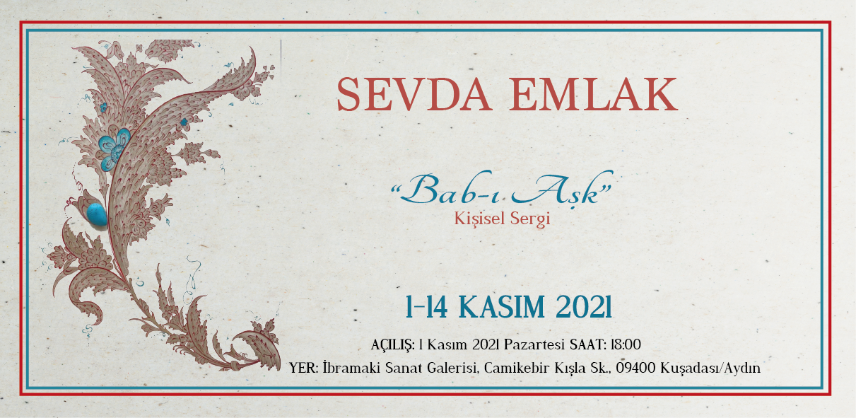 Fakültemiz Geleneksel Türk Sanatları Bölümü Dr. Öğr. Üyesi Sevda EMLAK'ın "Bab-ı Aşk" isimli kişisel sergisi, 1-14 Kasım 2021 tarihleri arasında Kuşadası İbramaki Sanat Galerisinde görülebilir. 1 Kasım 2021 pazartesi günü saat 18:00'de yapılacak olan sergi açılışına tüm sanatseverler davetlidir.